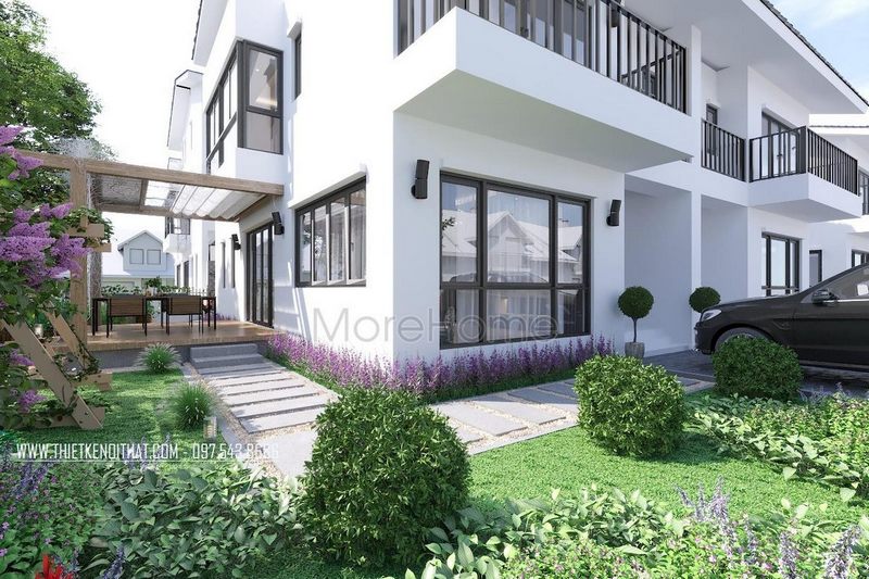 Mẫu thiết kế biệt thự, nhà phố phong cách tân cổ điển sang trọng với sắc trắng trẻ trung, tinh tế nổi bật trên phần sân vườn rộng thoáng.