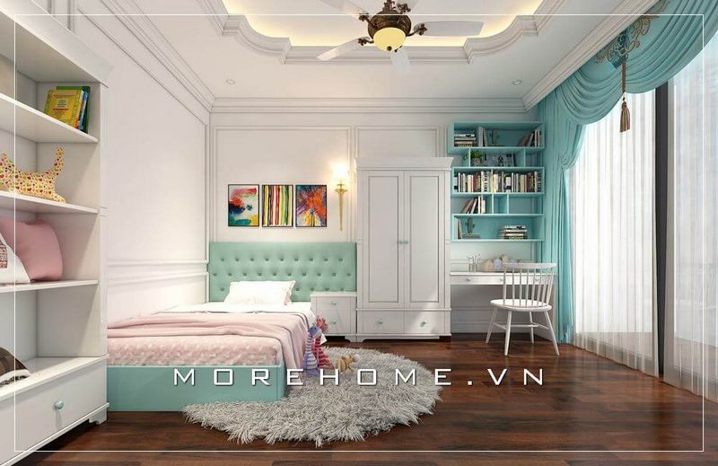 Gợi ý cho bạn cách sắp xếp, bố trí nội thất cho phòng ngủ bé gái đầy khoa học, chiếc giường ngủ bọc màu xanh đẹp mắt tạo điểm nhấn thu hút cho cả không gian này